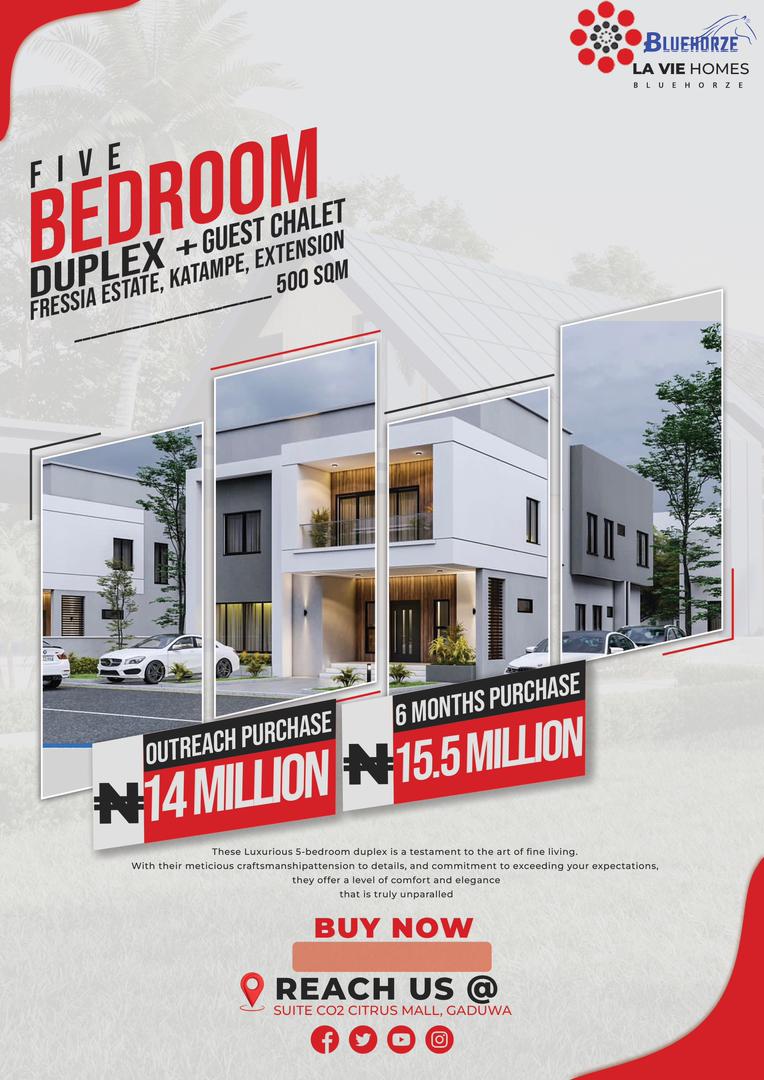 Everyone loves luxury and comfort when it comes to securing their dream home, Lavie homes got you as always. We are offering you our new 500sqm five-bedroom duplex plus guest chalet listing situated at Fressia Estate, Katampe Extension. This affordable offer was curated to help fulfil your dreams of living in luxury and comfort. It comes with electricity, water supply, security and other amenities. Don’t bite the dust on this one, Hurry now and make your money count!